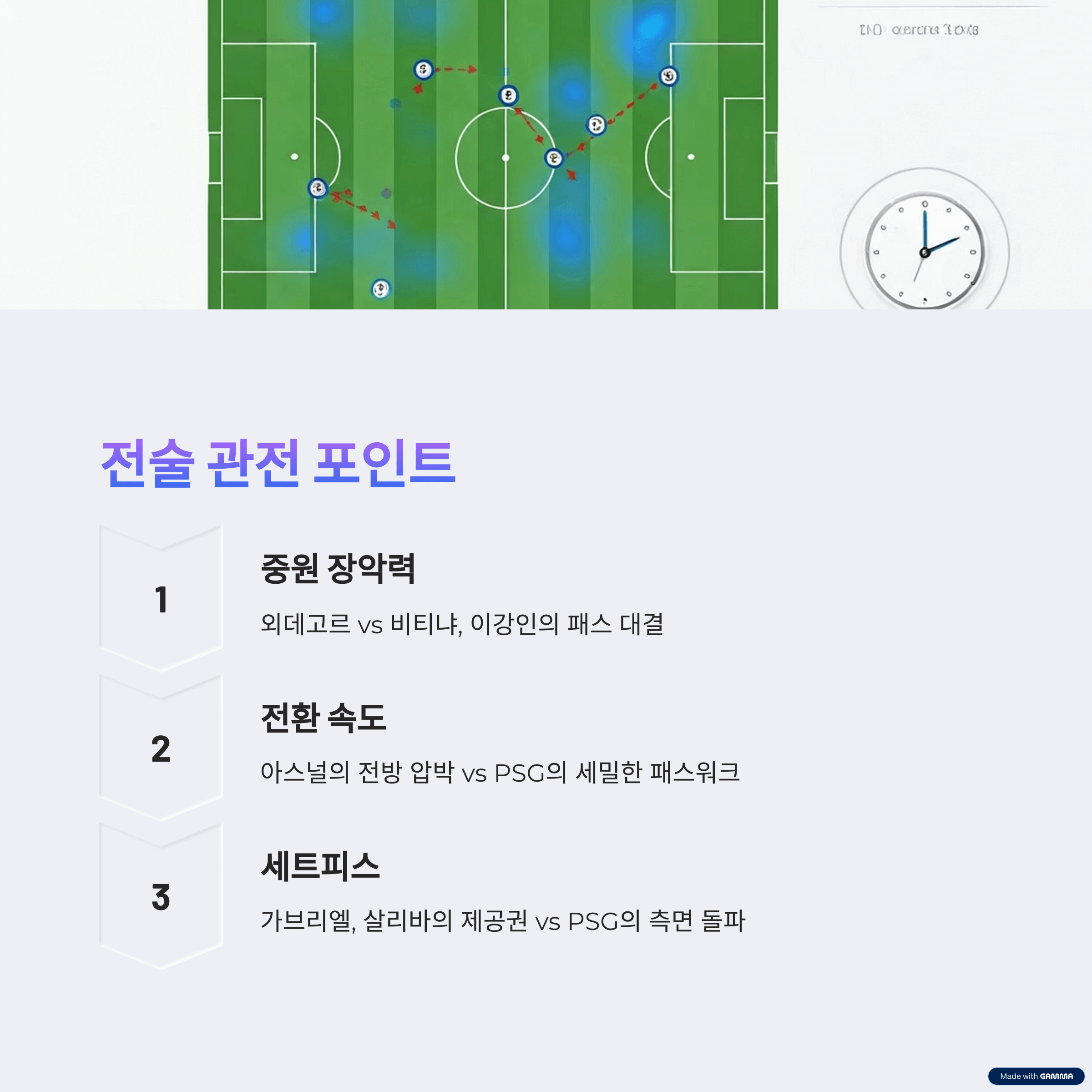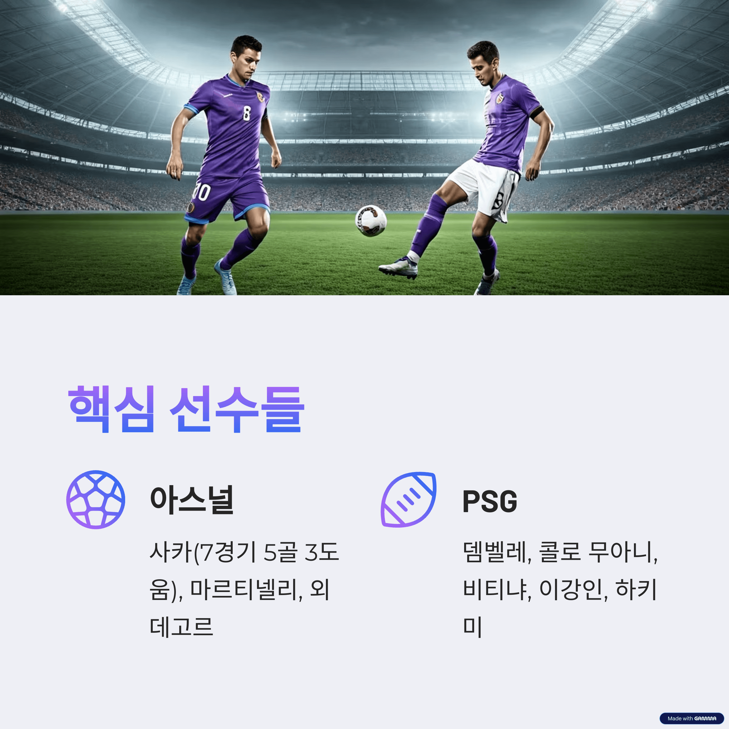 아스널은 부카요 사카, 가브리엘 마르티넬리, 마르틴 외데고르를 중심으로 한 창의적 공격 전개가 강점입니다. 특히 사카는 이번 대회에서 7경기 5골 3도움을 기록하며 상대 수비진의 경계를 받고 있고, 외데고르는 중원에서 공격과 수비를 매끄럽게 연결하는 핵심 키플레이어입니다. PSG는 킬리안 음바페가 빠진 이후에도 우스만 뎀벨레와 란달 콜로 무아니의 빠른 측면 돌파, 그리고 비티냐와 이강인이 이끄는 유기적인 중원 조합이 위협적입니다. 수비에서는 아슈라프 하키미의 오버래핑과 마르퀴뇨스의 안정된 센터백 플레이가 강점입니다. 이번 경기의 핵심은 중원 장악력과 전환 속도입니다. 아스널은 전방 압박을 통한 빠른 역습을 노리고, PSG는 세밀한 패스워크와 라인 사이 공간 활용으로 대응할 것으로 보입니다.