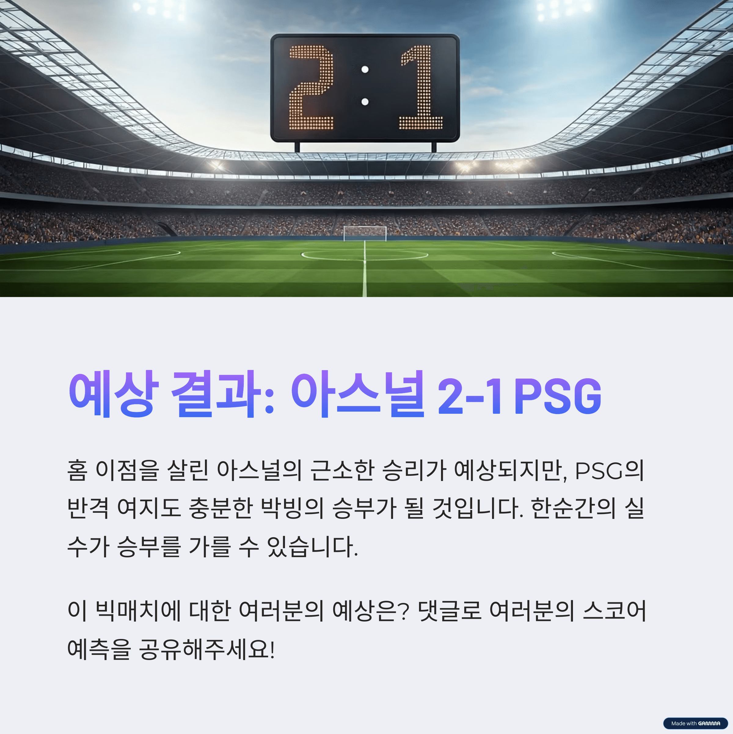 예상 스코어는 2-1로 아스널의 근소한 승리를 점쳐봅니다. 홈 이점을 살린 집중력과 최근 기세가 PSG보다 앞서 있기 때문입니다. 하지만 PSG의 반격 여지도 충분히 존재하므로, 한순간의 실수가 승부를 가를 수 있는 박빙의 승부가 될 것입니다.