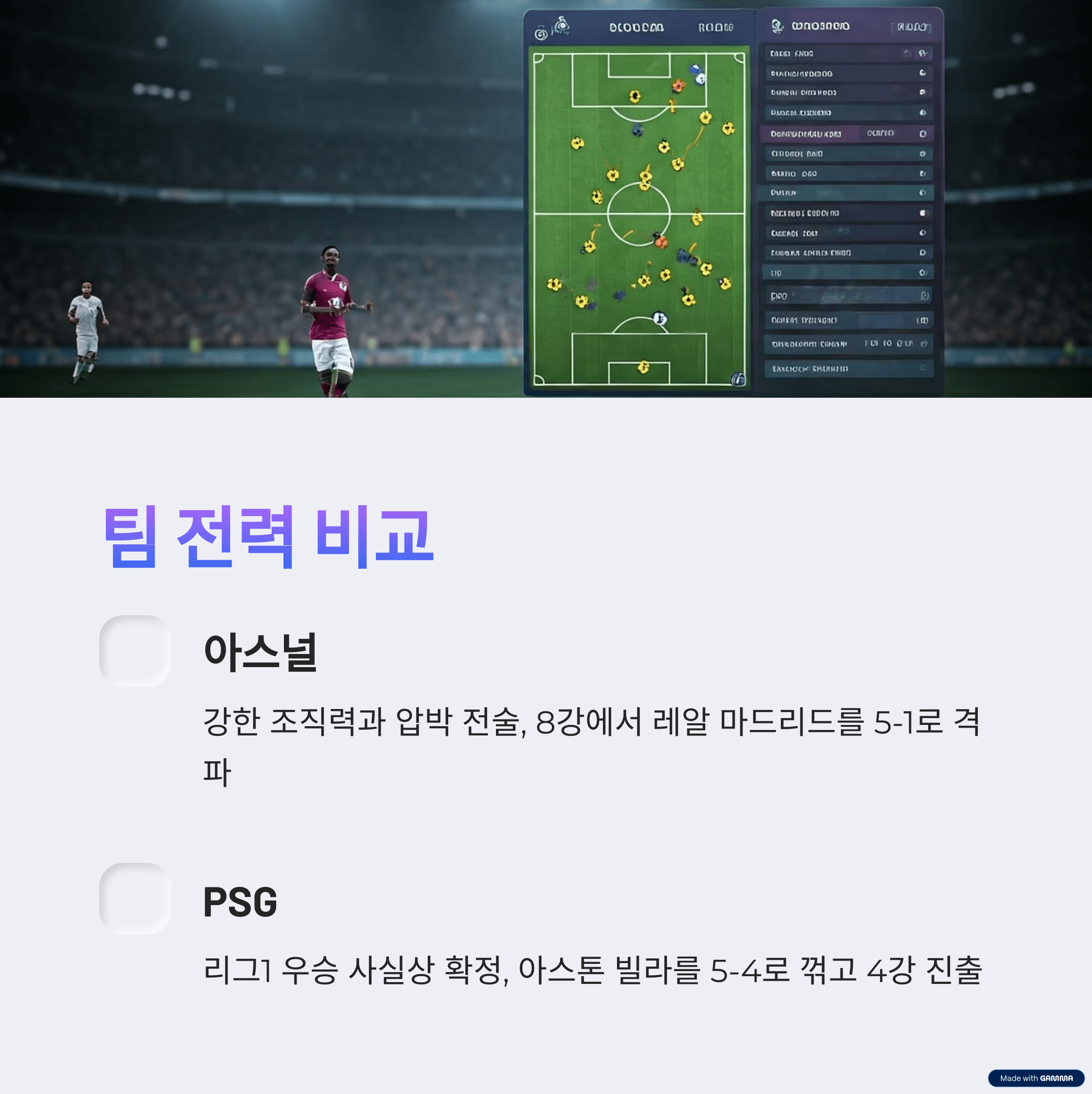 아스널은 이번 시즌 프리미어리그에서 리그 우승 경쟁을 펼치며 강한 조직력과 압박 전술로 주목받고 있습니다. 미켈 아르테타 감독은 젊은 선수들과의 조화를 바탕으로 빠른 공수 전환과 촘촘한 수비 라인을 구축했고, 챔피언스리그 8강에서는 레알 마드리드를 5-1이라는 스코어로 꺾으며 돌풍을 일으켰습니다. 반면, 파리 생제르맹은 리그1에서는 여전히 압도적인 전력을 자랑하며 우승을 사실상 확정지었고, 챔피언스리그에서는 잉글랜드 강호 아스톤 빌라를 5-4로 꺾고 4강에 진출했습니다. 루이스 엔리케 감독 체제에서 더욱 유기적인 플레이가 강조되고 있으며, 비티냐, 라모스, 이강인 등이 탄탄한 중원 운영을 보이고 있습니다.